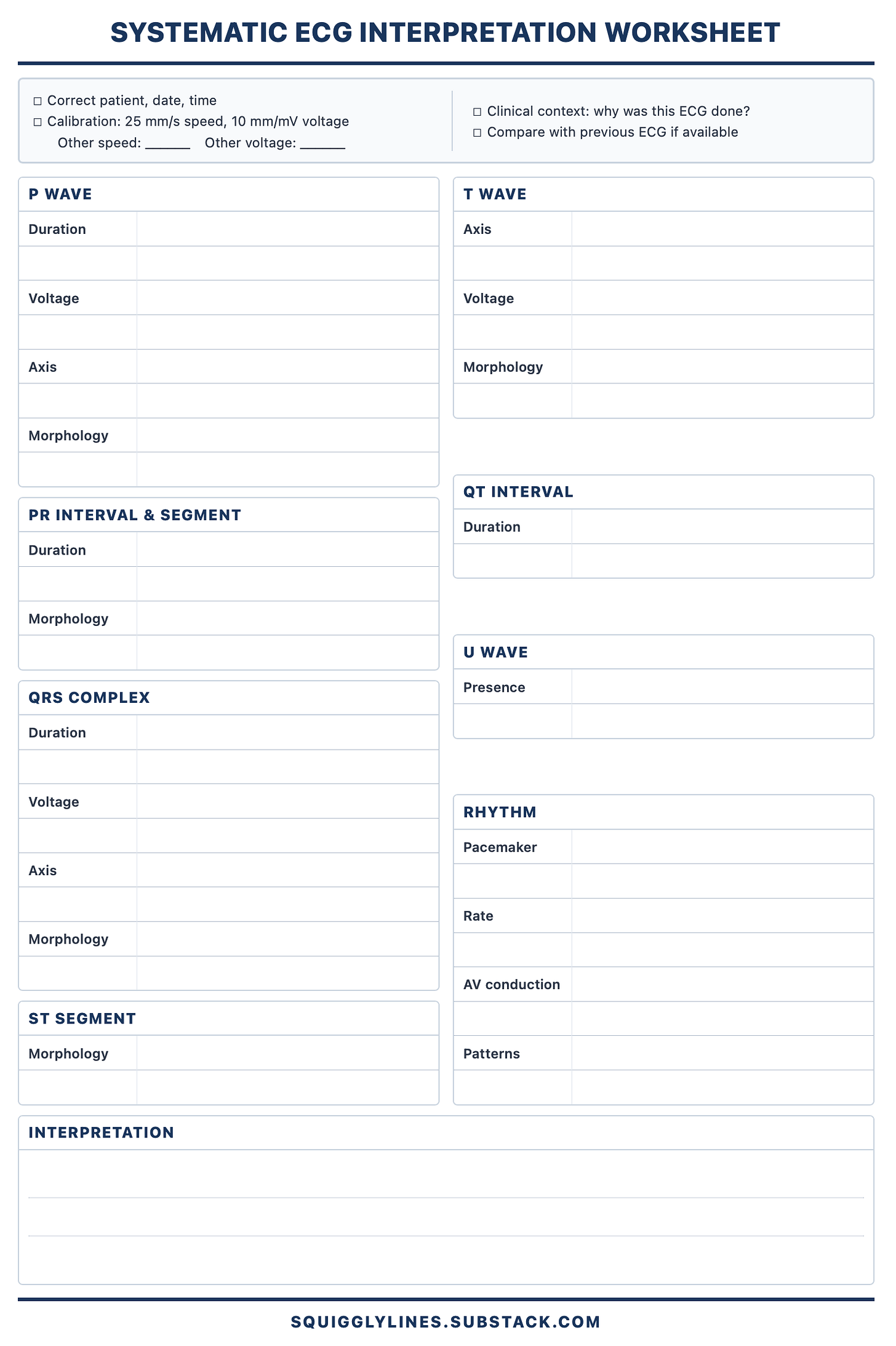 The second is a practice worksheet: the same systematic structure, but blank. Print a stack, and fill one in every time you interpret an ECG until the system becomes automatic.
