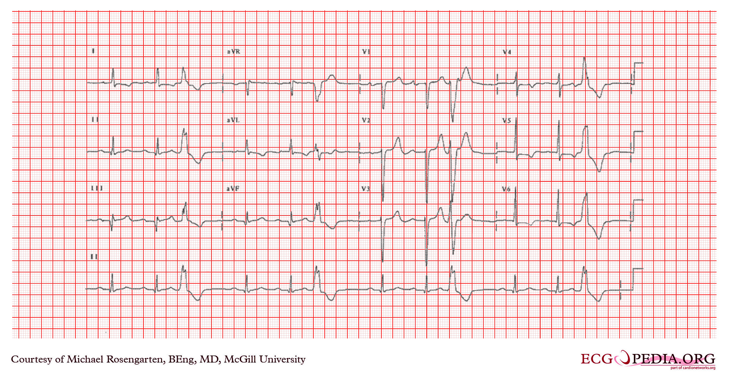 Ventricular tachycardia. VT is three or more consecutive ventricular beats at a rate above 100 bpm. Although this ECG has multiple PVCs, they are not consecutive.